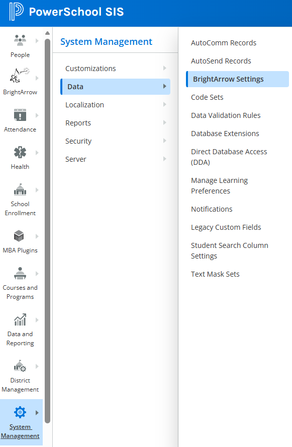 - Go to System Management > Data > BrightArrow Settings