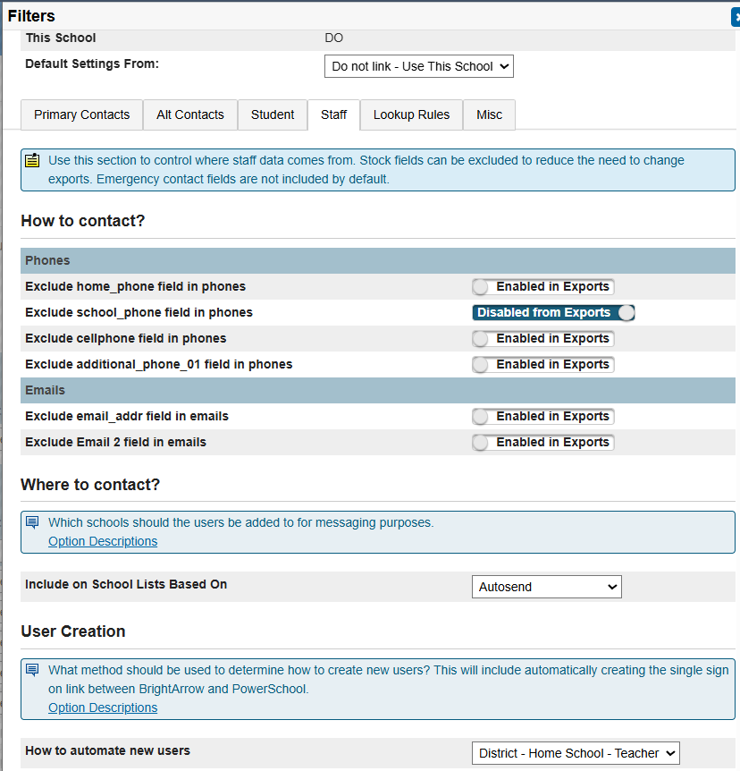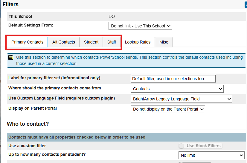 - Under the "Staff" tab you can set the "How to Contact" filters along with some additional filters for list generation and user creation.