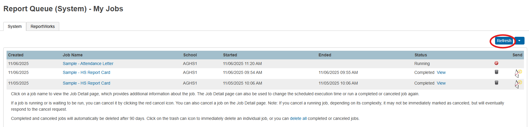 - From the Report Queue (System) page wait until your report has completed running. If you don’t have auto-refresh enabled you may need to refresh the screen a few times.