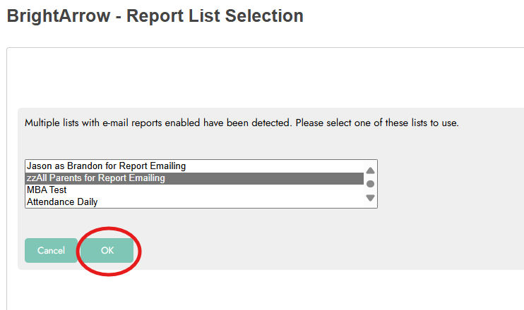 Note: the number of contacts will be the list size, not the number of individual student reports it found. Even though it may say 100 it will only be able to email the report to the contacts who have a report with a matching student number. If there is no report to send they will not receive an email.