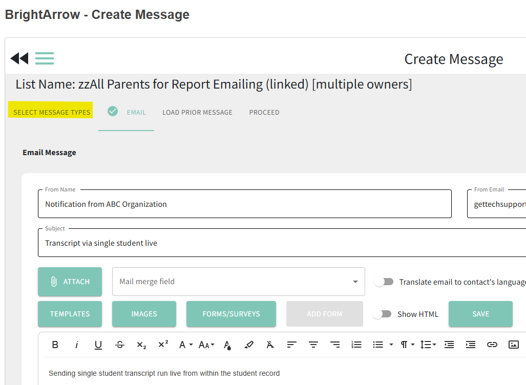 - The Email option should automatically be selected, but if you are not brought directly into the email creation page, click on "Select Message Types" and check the option to send an email.