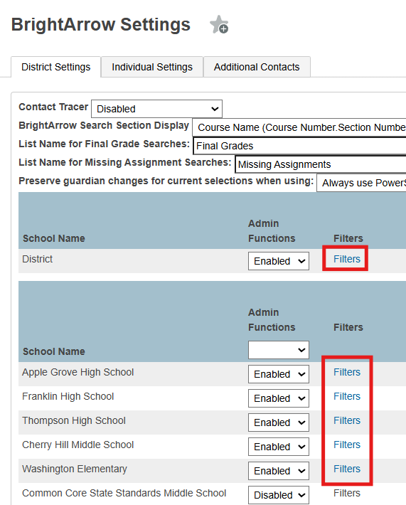 - Click on Filters. If doing this from District Office (shown below) then select the filters in the row corresponding to the district or specific school you wish to alter.