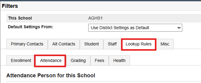 - Lookup Rules contains the various settings that can change by school, organized by topic. Click on Attendance