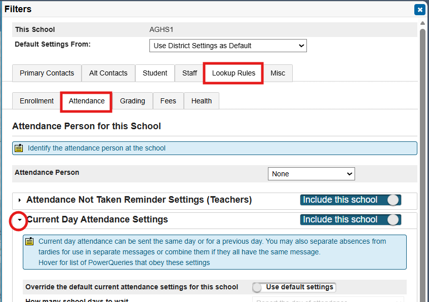 - Lookup Rules contains the various settings that can change by school organized by topic. Click on Attendance
