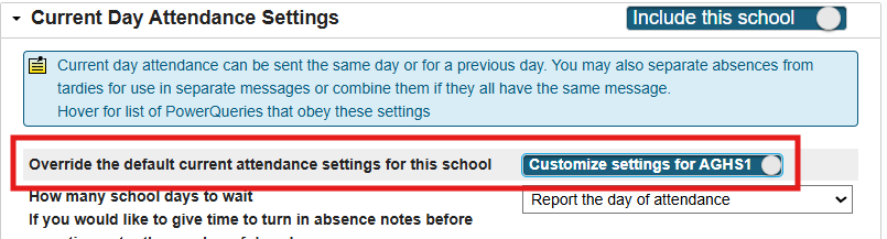 - Turn ON the toggle to "Override the default current attendance settings for this school" to override the district settings