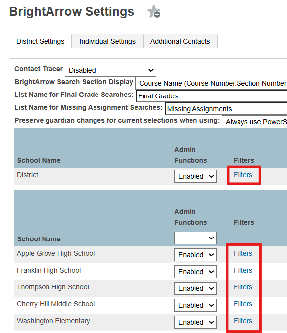 If you have different schools needing different settings, you can do that as well. First set up the district default by changing the filters in the District row. That will become the default for all schools that are not being overridden.