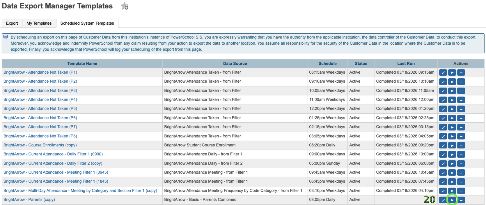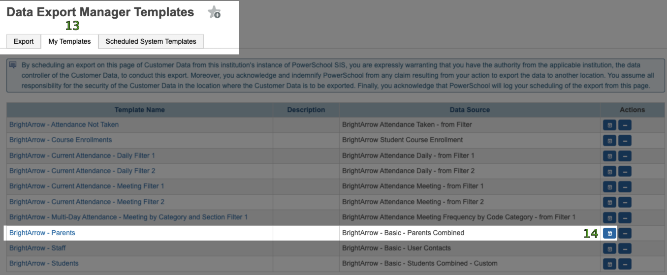 - Find the row for the new template and click the calendar button to schedule this template. If you do not see the calendar button or the Scheduled System Templates tab you don't have permission to schedule exports. For more information on that read Enabling DEM Scheduling