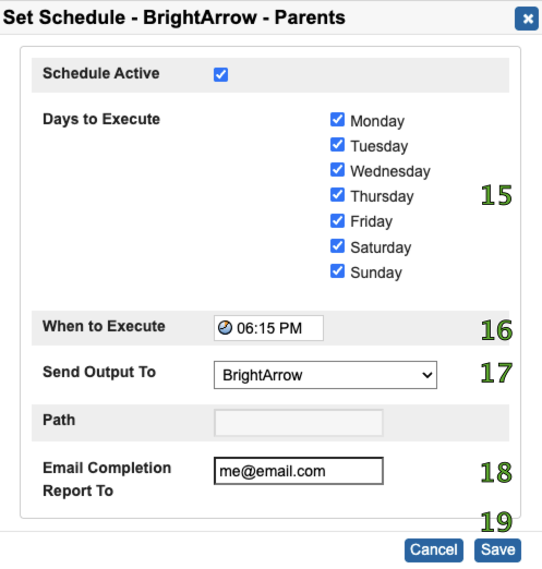 - Email Completion Report To (optional) = your email or an email to keep a record of if the export and file transfer was successful or if it failed.