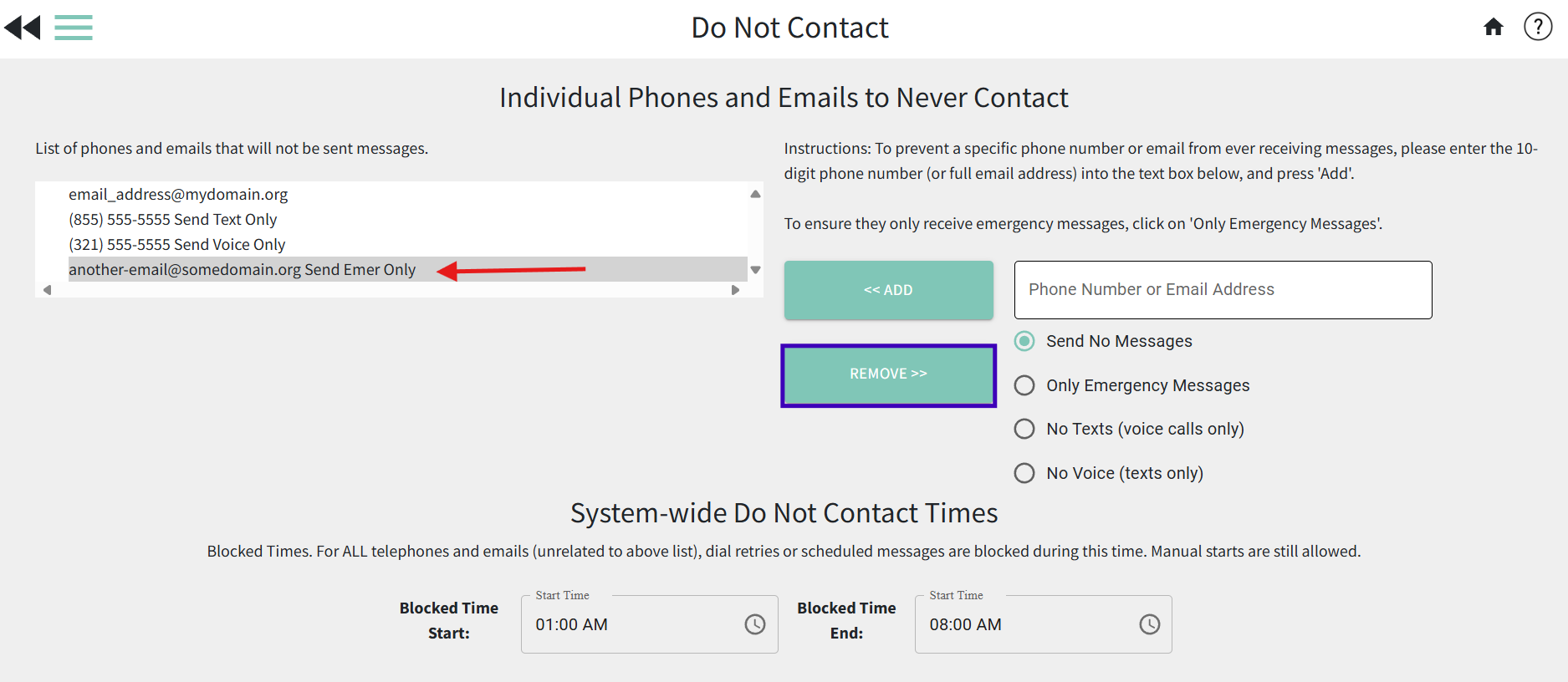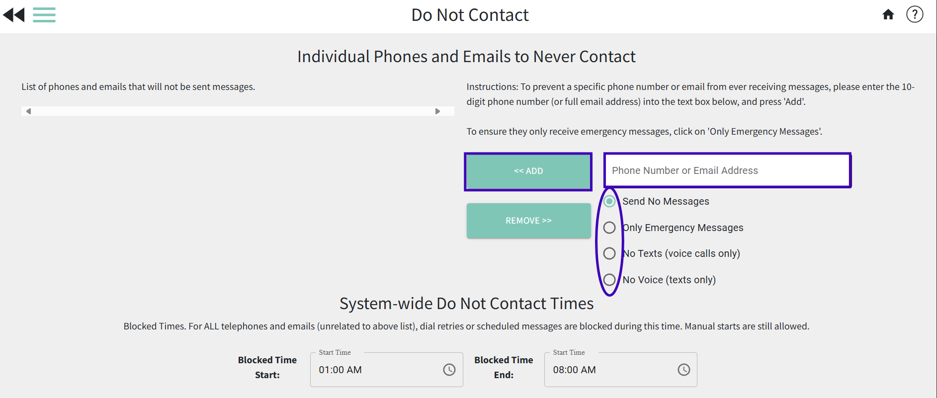 If your administration decides that they want to block users from accidentally scheduling messages to send out during certain times, you can set system-wide "do not contact" times. Users will still be able to create and send a message manually during these hours, however, they will not be able to schedule a message to send during these hours. This helps to make sure your contact's phones aren't ringing if a user accidentally schedules the message to send at 2:00AM instead of 2:00PM. Also, if your list is still re-dialing calls for recipients who have not answered the phone, with the system-wide do not contact times in place you can ensure that the calls will stop trying to re-dial.