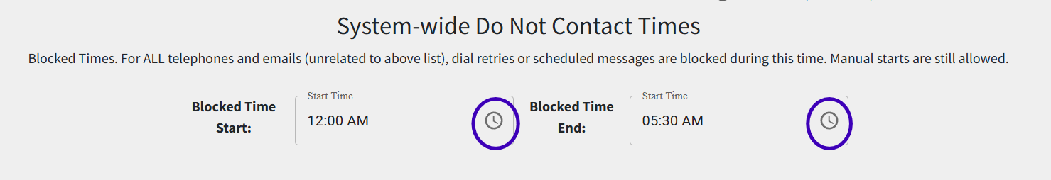 3. At the bottom of the page, in the "System-wide Do Not Contact Times" section, use the clock icon to select the timeframe that messages should not send during