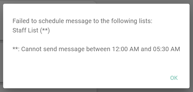 5. If users try to schedule a message during the "blocked" timeframe, they will receive an error message stating that they cannot schedule the message
