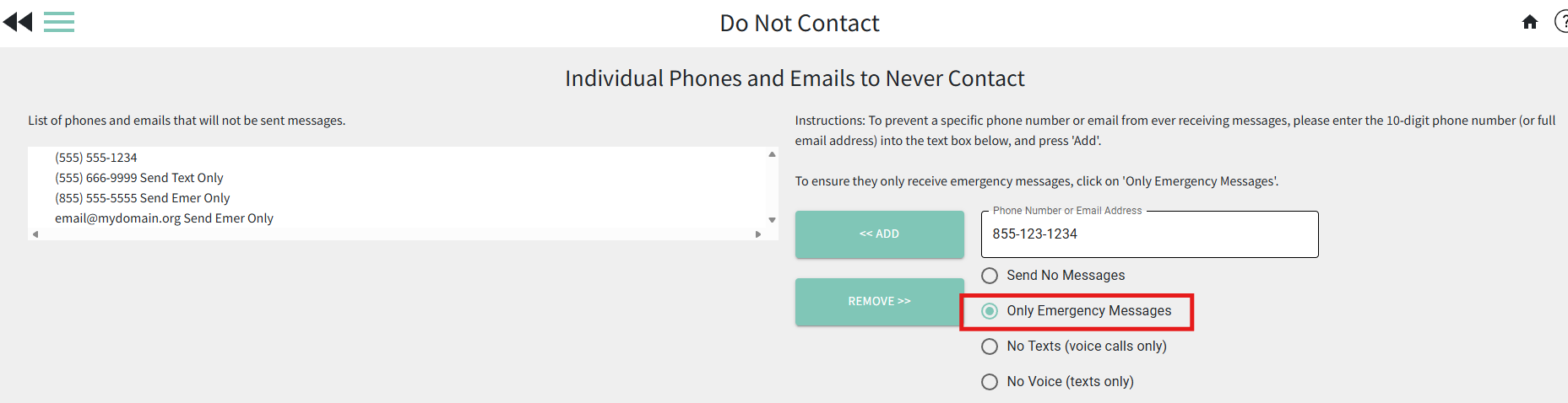 If you have a contact who wants to receive emergency alerts only and not any "regular" messages, you can add them to the Do Not Contact list with the "Only Emergency Messages" radio dial selected. Note that in order for the contact to receive emergency text messages, they must still opt in by texting Yes to 79041 (applies to USA recipients only).