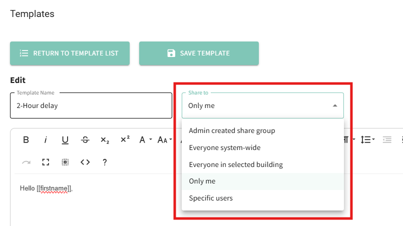 - Everyone in selected building = another group's users. Using this option will prompt you to select the group to share the template with.