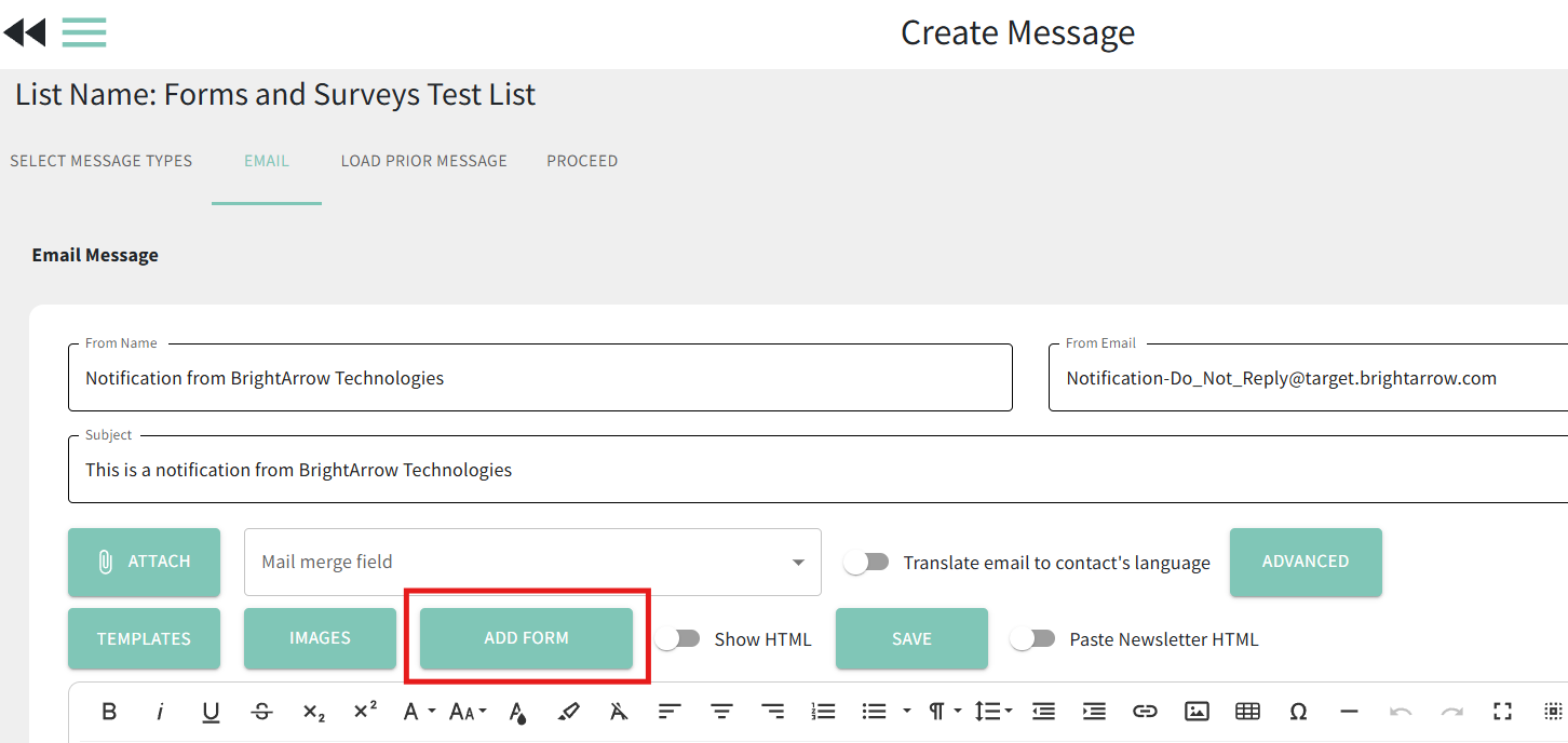 - On the email message creation page, click the Add Form button to start creating your form or survey or to open a form/survey you've previously created.