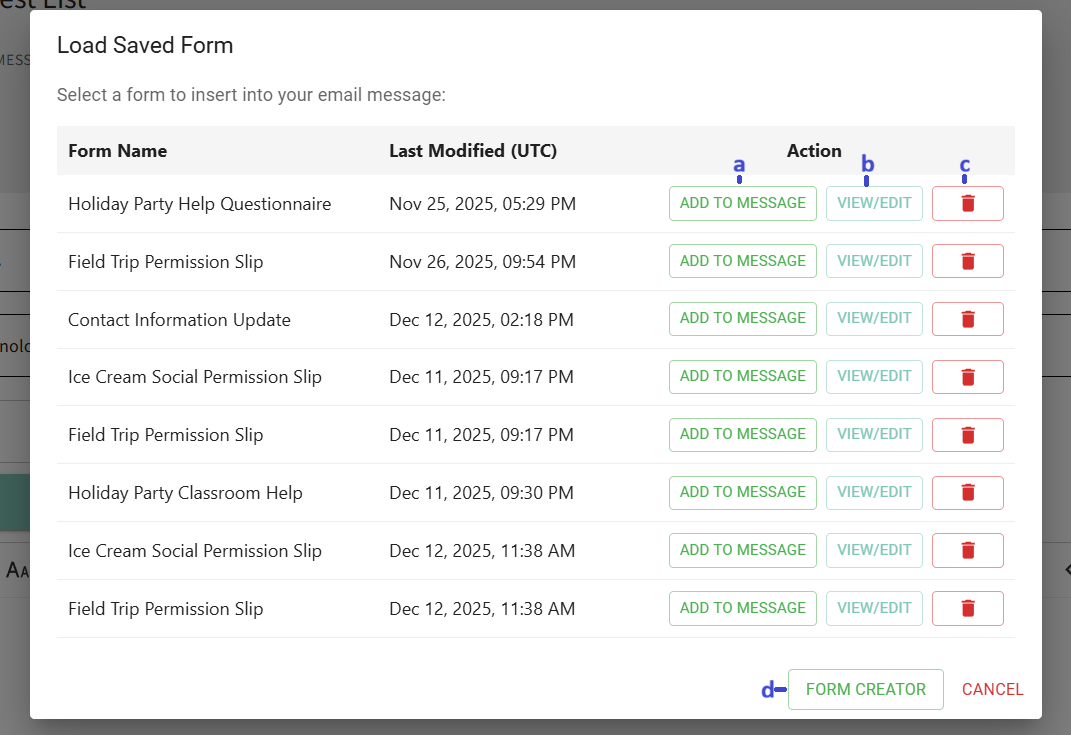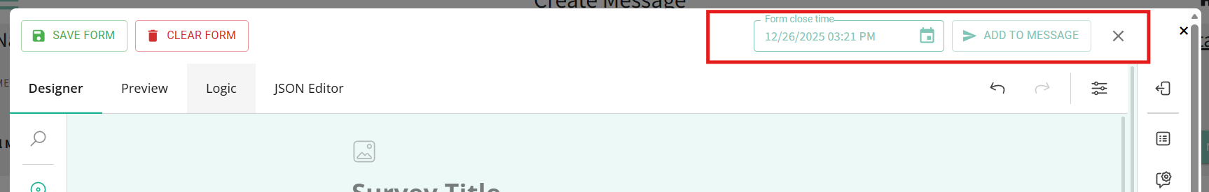 - With your form now saved, you can pull it up again later (reference step #5 of this article), or add it to your email message right away using the "Add to Message" button. You can also set the "Form close time" if you'd like to set an expiration date/time on your form so that it cannot be completed by your contacts after the Form Close Time has lapsed.