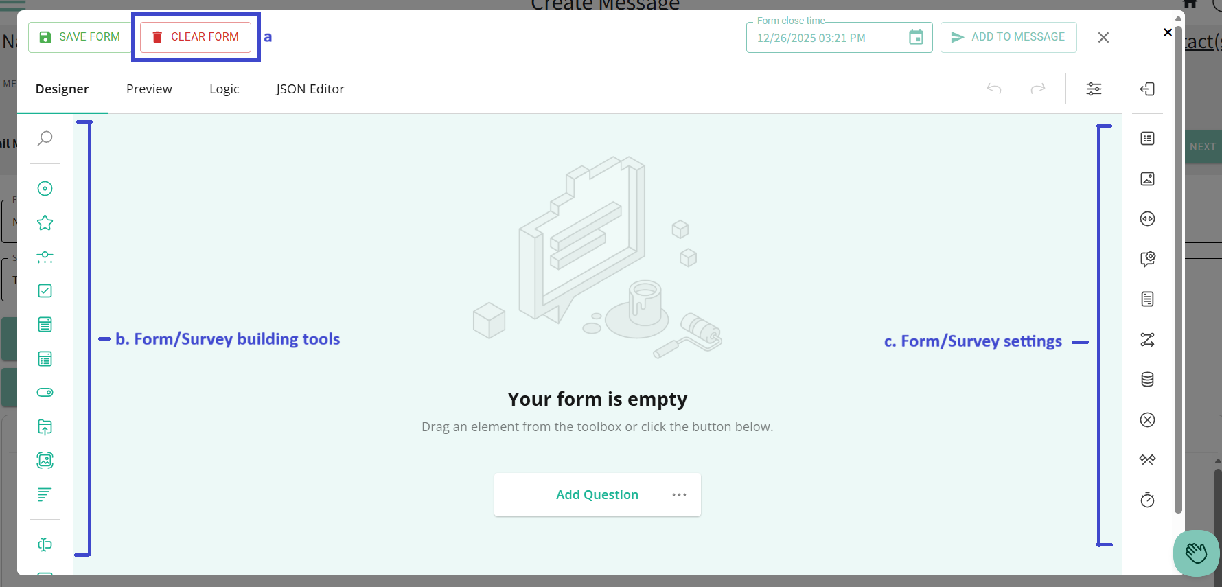- After clicking either the View/Edit button or the Form Creator button, the Forms/Surveys creation window will open and you can start creating or editing your form.