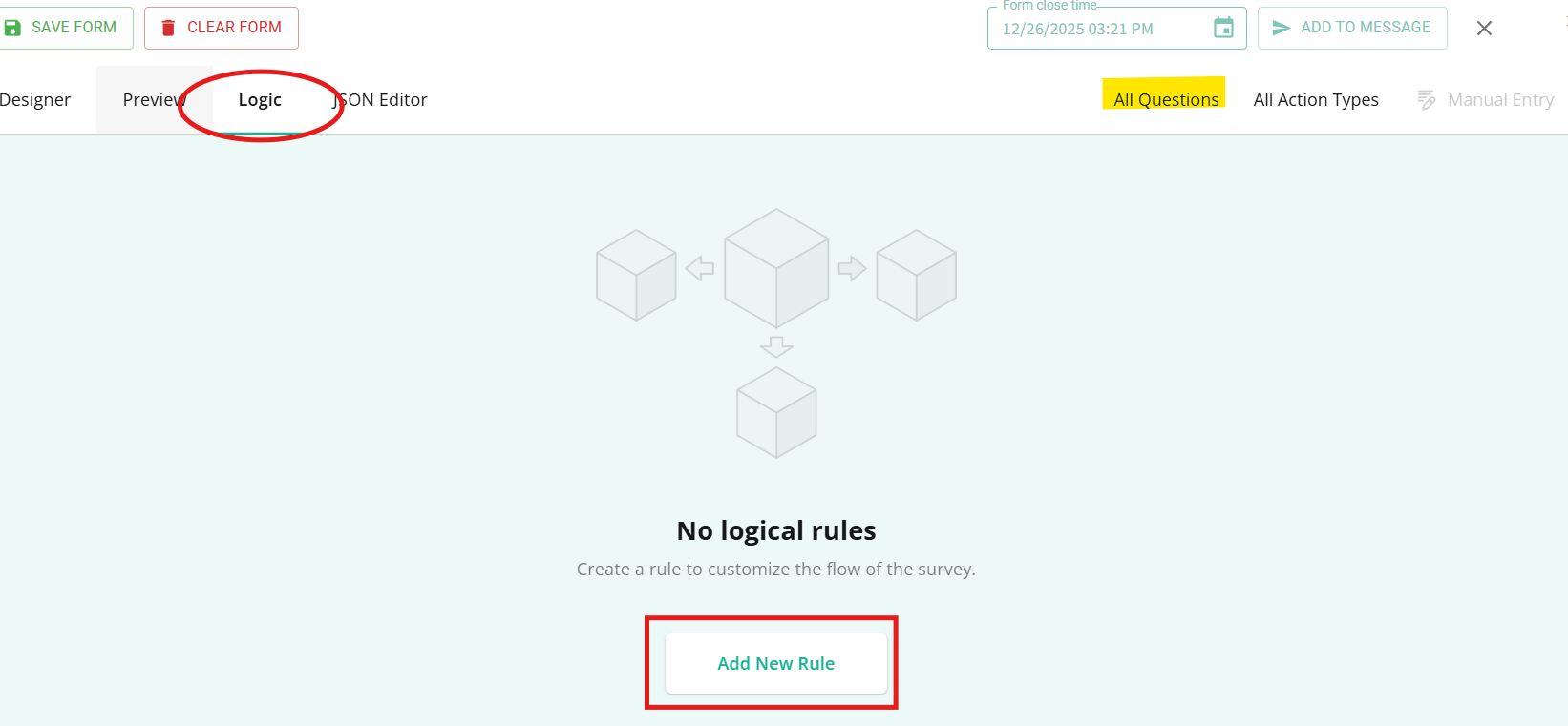 - To apply logic to specify the flow of the entire form/survey, use the "Logic" tab located at the top of the screen.