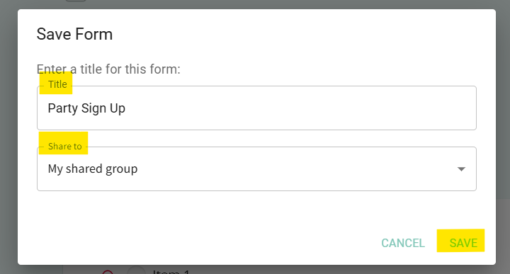 - In the pop-up window, give your form a name that will make it easy to find again in the future and use the "Share to" option to specify if you would like to share the form with any other BrightArrow users in your organization. Then, click "Save."