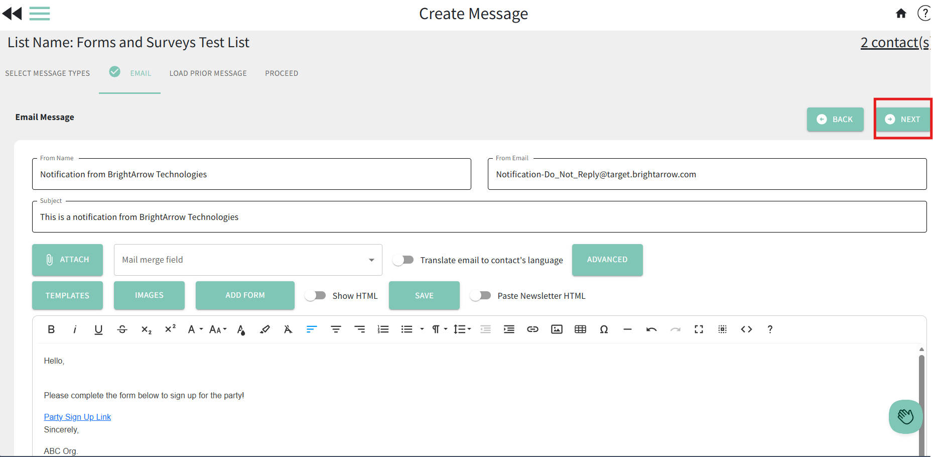 - Start by clicking on the name of the list that you want to send the form or survey to, then create a new message.