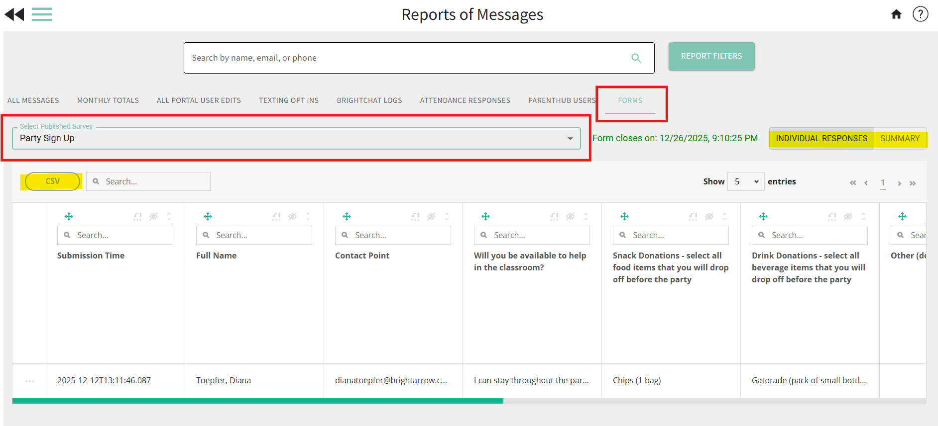 Once your survey or form has been sent, you can see the responses in the BrightArrow Reports page under the "Forms" tab.