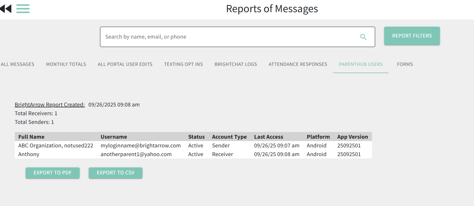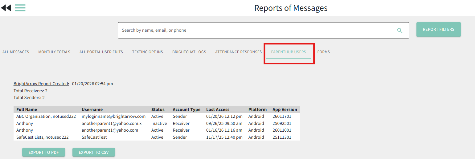 If you would like to know data about how many of your contacts are actually using the ParentHub app to view messages, you can get that information on the Reports page.