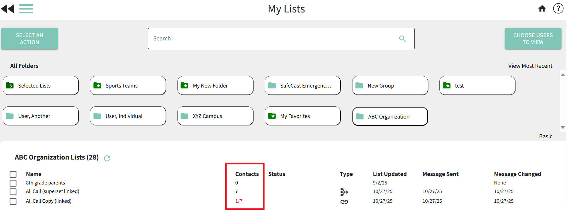 - If the number of contacts is listed in red, not all contacts in the list are enabled. Formatted # / #, with the first number being the number of contacts who are selected/enabled and the second number being the total number of contacts in the list. For example,