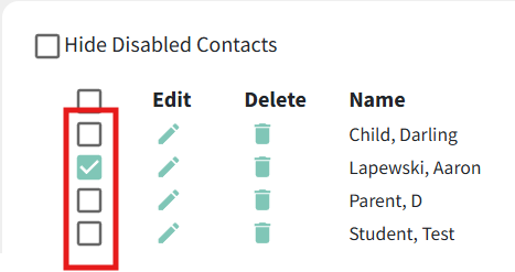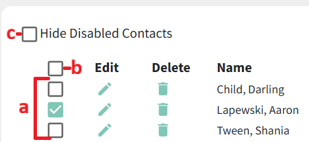 - Use the checkbox next to the bolded "Edit" column header to enable/disable all contacts.