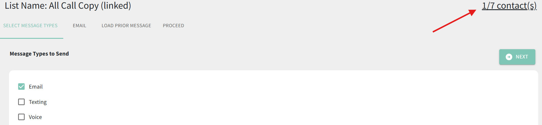 - From the Create Message page, the number of contacts is shown in the upper right corner. For example, 1/7 contact(s) is indicating that the message will only send to 1 of the 7 possible contacts in the list because only one is enabled.
