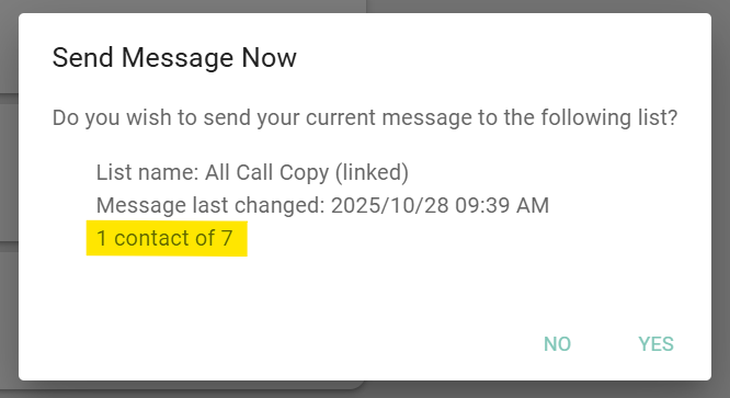 - When you go to send your message, there will be a pop-up window asking you to confirm that you want to send your message. That window will show how many contacts your message is going to try to send to. For example, "1 contact of 7" is indicating that there are 7 contacts in the list, but only 1 of them is enabled. The message will only send to that one contact.