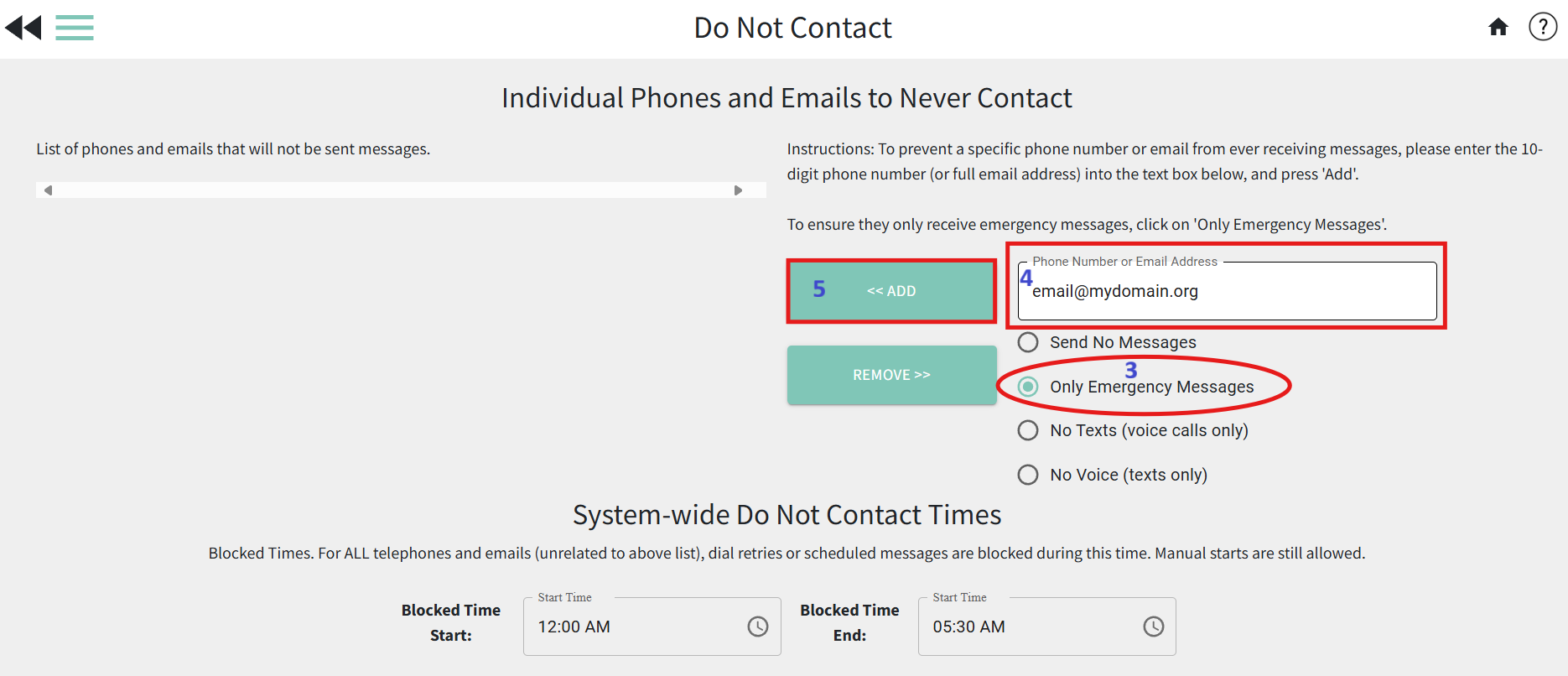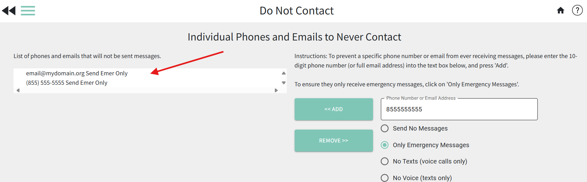 - Once the phone number or email address has been added to the Do Not Contact list, you will see it listed in the column on the left with "Send Emer Only" next to it to indicate that they will now only receive emergency messages to that phone number or email address.