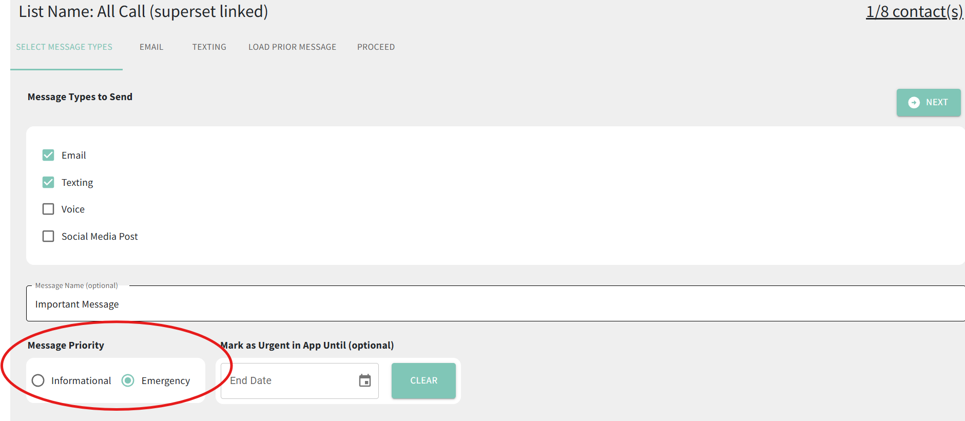 - On the first page of the message creation under "Message Priority," make sure the "Emergency" radio dial is selected.