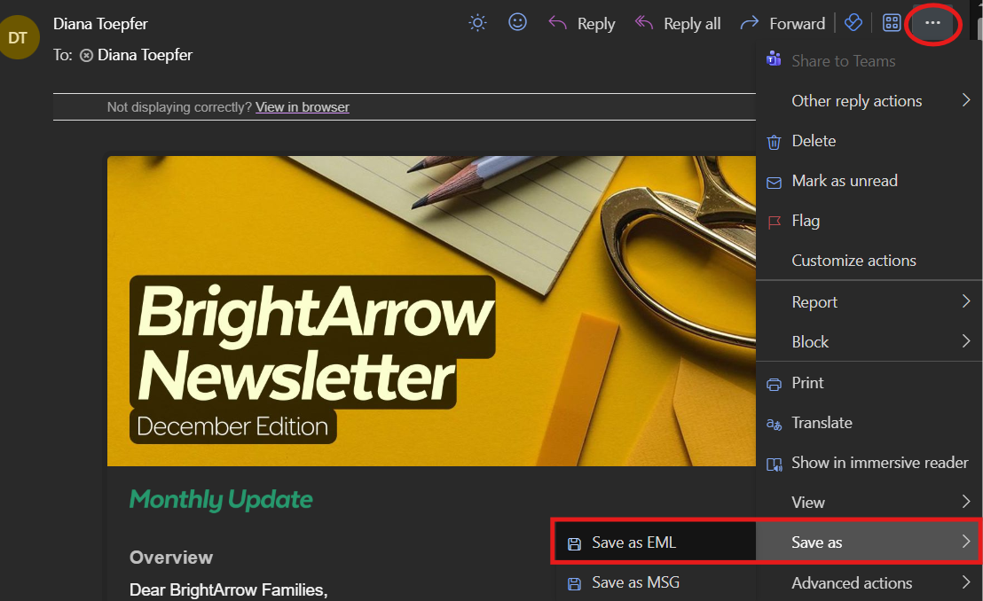 - Outlook does not allow you to right-click>inspect. If you have access to a different email provider, we recommend using that for this task. If you only have access to Outlook, click on the 3 dots in the upper right of the email window. Then, click Save As > Save As EML. You will then need to open the EML file in Notepad or another software that allows you to view and edit the HTML to proceed.