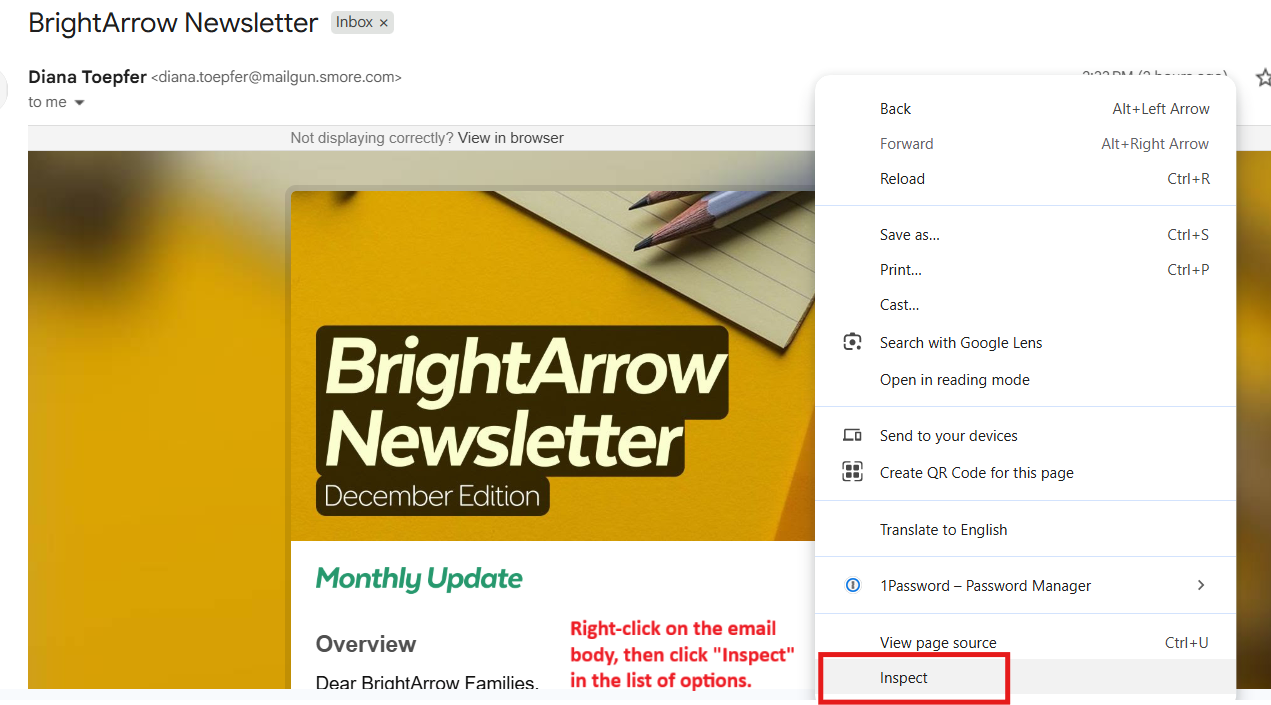 - The next step is to "inspect" the email so that you can view the HTML code. Right-click on the email and choose "Inspect" from the list of options.