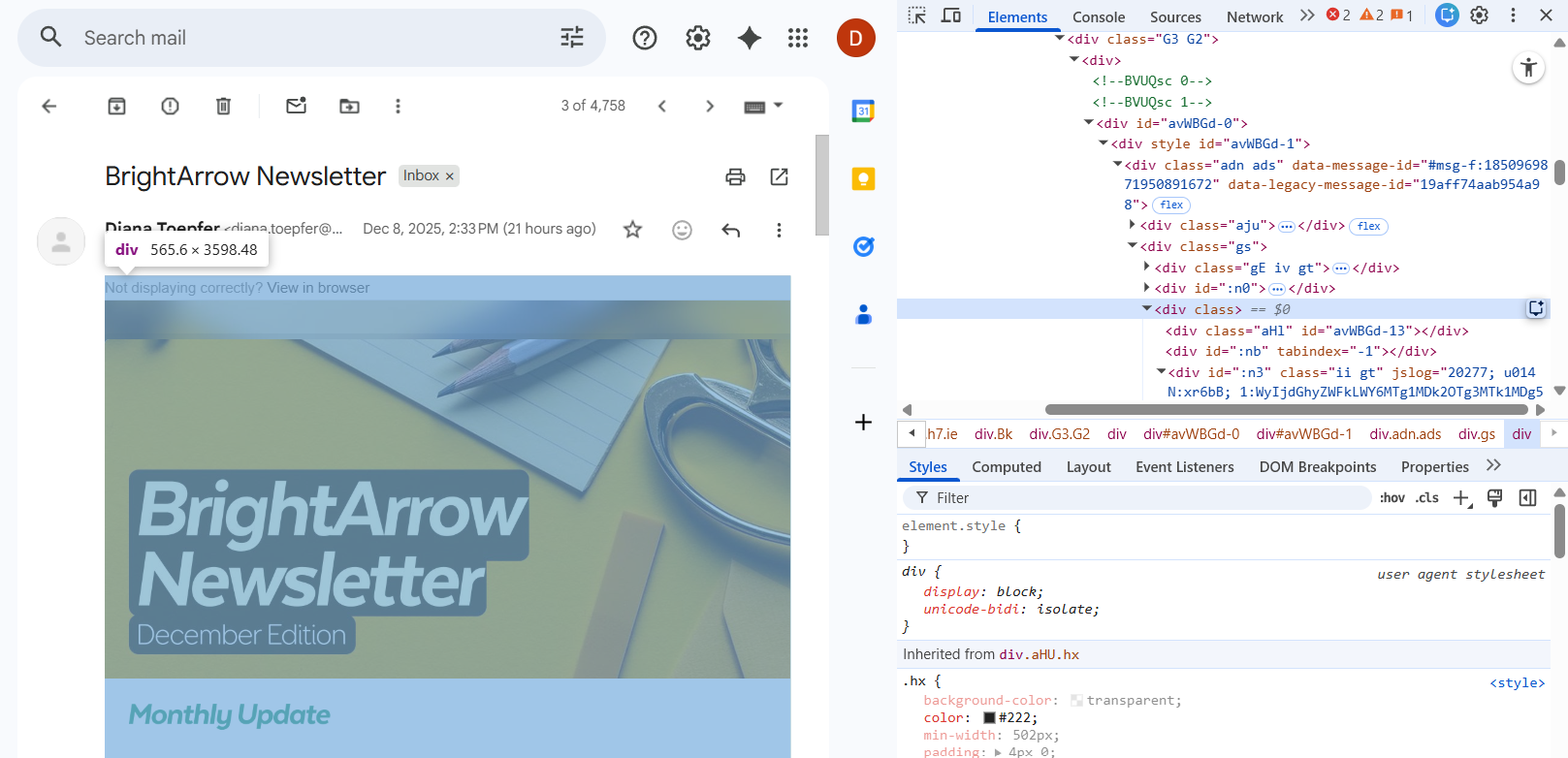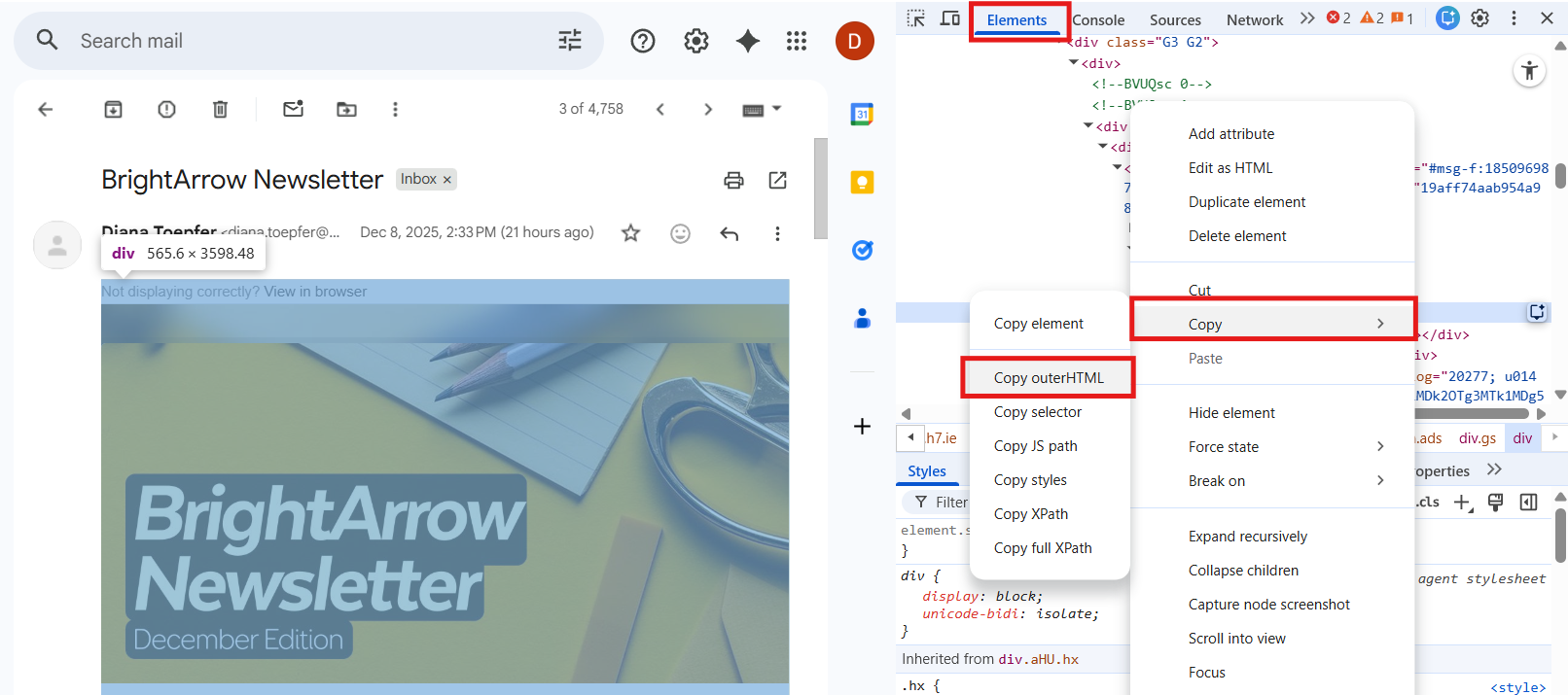 - In Gmail or any other email provider that allows you to right-click and "inspect," in the window scroll down through the HTML elements until you get to the LOWEST <div> line that highlights all of the newsletter and none of the other information that's specific to your email like the to or from address.