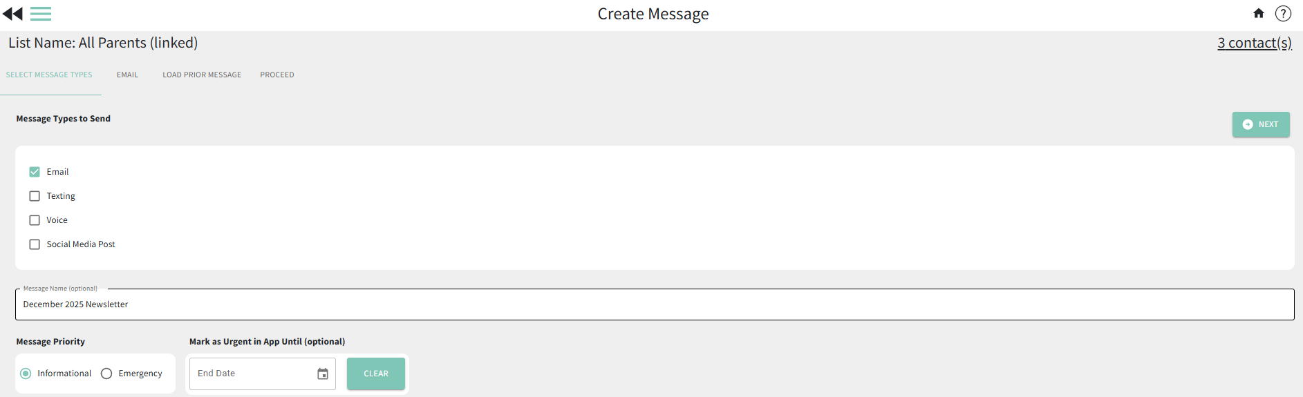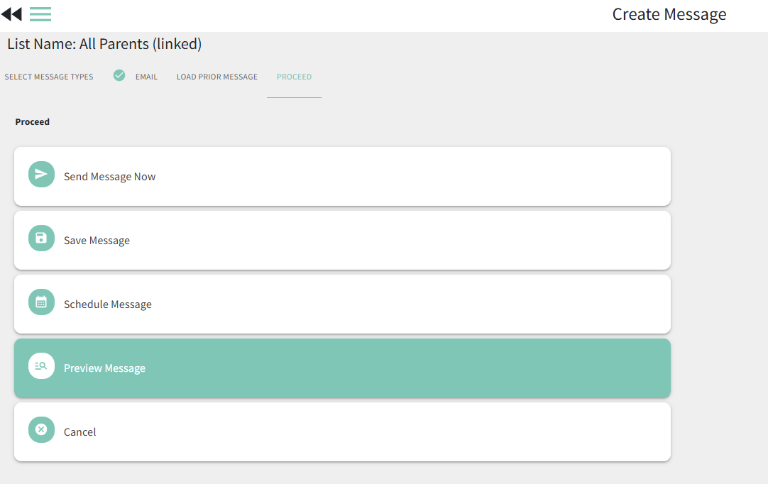 - Here you can send the message now, save the message for later, schedule the message to send at a future date/time, or preview the message.