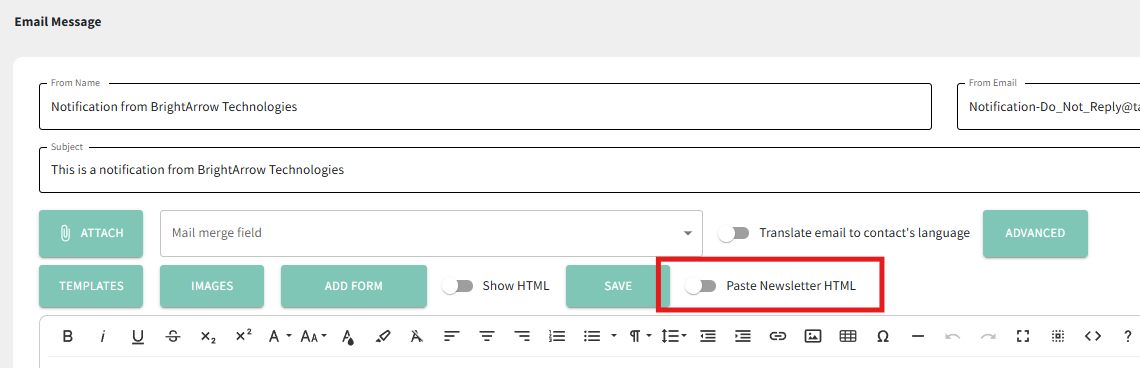 - With the newsletter now copied to your clipboard, open BrightArrow. You're going to paste the HTML into a new BrightArrow message.