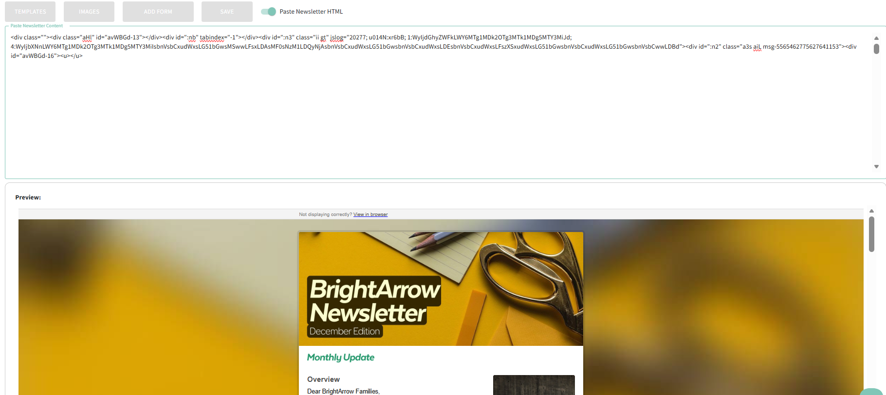 - You now need to remove some of the HTML code before pasting it into your BrightArrow message. Otherwise, your newsletter will show all the code associated with the email you sent yourself, like the to and from address, email subject, etc.