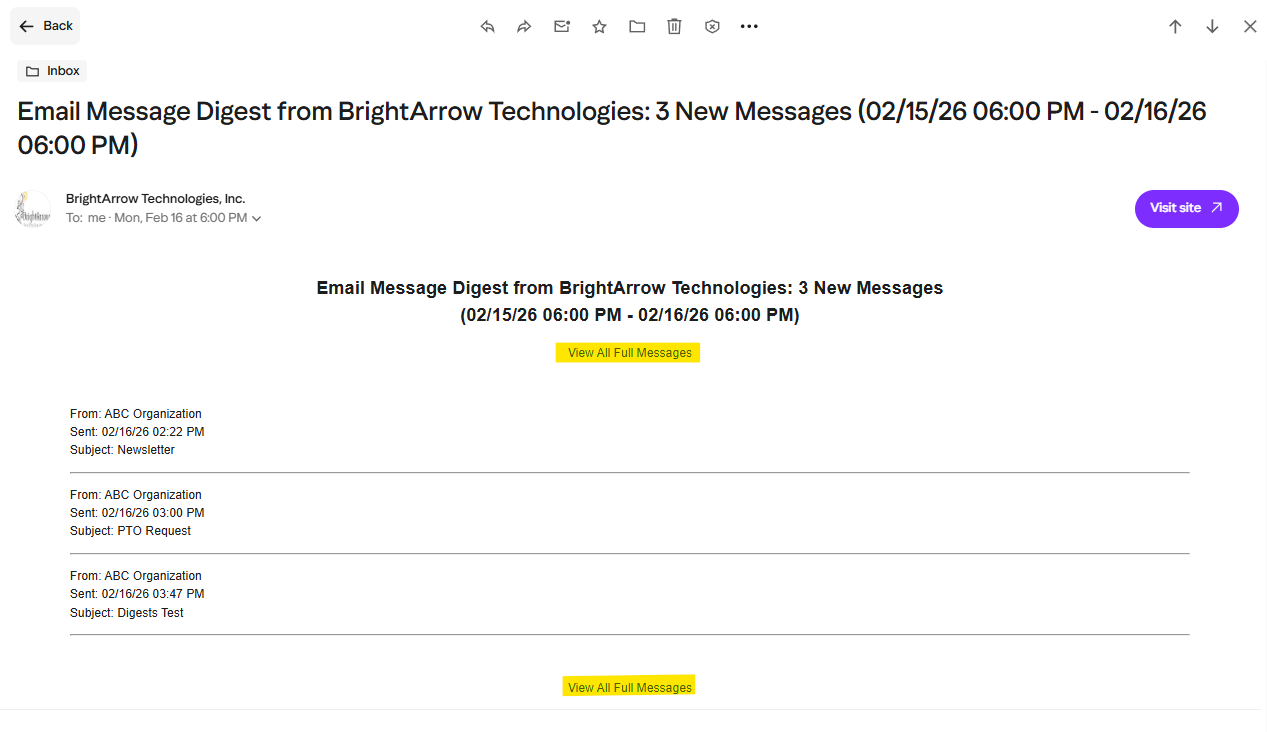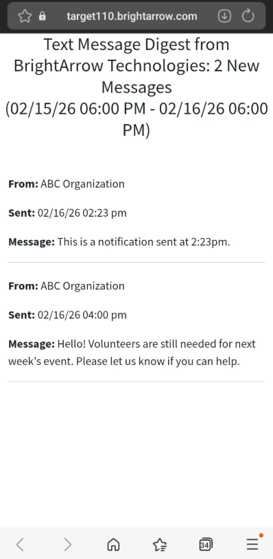 If you completed the steps above to enroll in message Digests, you will start receiving informational messages each day at the time your organization has set. You can enroll to receive email messages in Digest form, text (SMS) messages in Digest form, or both. If you enroll in Digests for both email and text, you will receive one Digest email and one Digest text message each day at the specified time.