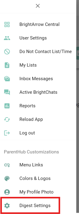 Once the organization has set up the Digests feature in BrightView (web version of BrightArrow), message recipients will see the option to enroll in Digests in their ParentHub app Menu settings. Each ParentHub user can enroll to receive Digest emails and/or Digest text messages. ParentHub users can change their enrollment at any time through the app. The Digest messages will be sent at the time of the organization's choosing. Note that voice calls are excluded from Digests, so message recipients will receive the calls when they are sent from the organization.