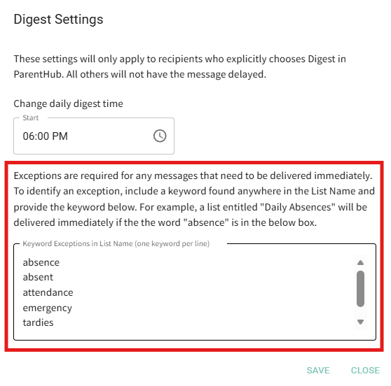 - Use the "Keyword Exceptions in List Name" box in the Digest Settings to add any additional exclusions. If the list name contains the keyword entered in the box, the message will send right away and will also be included in the Digest summary message.