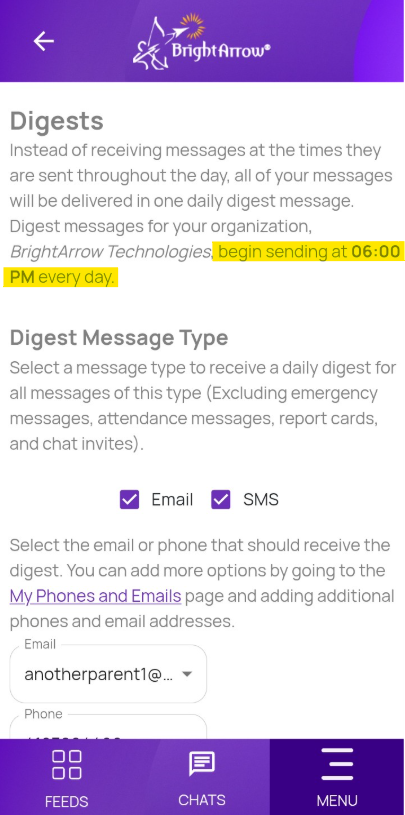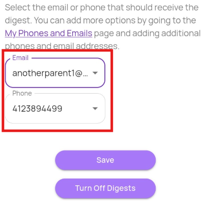 - If you already have multiple phones or emails linked to ParentHub, you will have the option here to determine which phone or email you would like to use to receive your Digest messages.