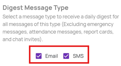 - If you check both boxes, you will receive one email message Digest summary that contains all of the emails that were sent to you that day AND one text message Digest summary that contains all of the text messages that were sent to you that day.