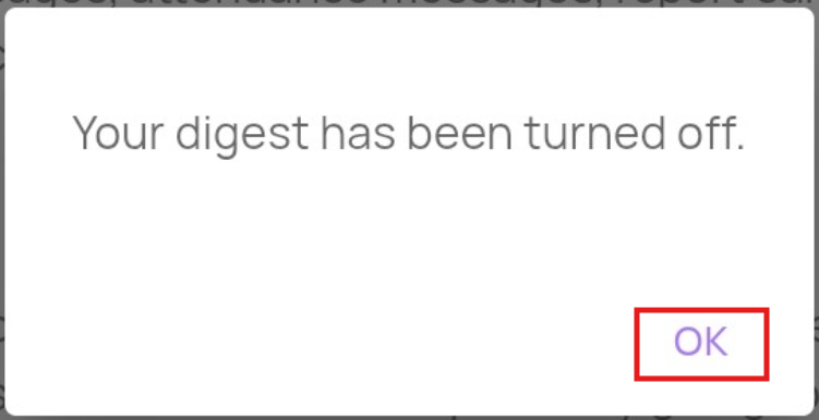 - A pop-up window will appear to confirm that you successfully enrolled in email Digests. You will now receive a summary email at the specified time that includes any informational emails that were sent to you that day. Your text messages will be delivered to you at the time they are sent from your organization. You will not receive a summary text message.