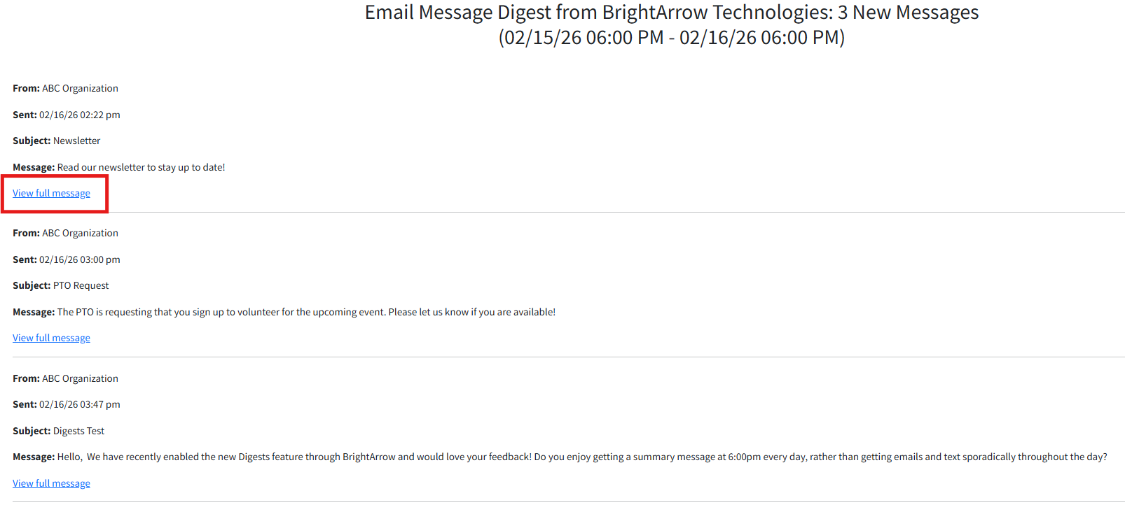 Click the link to "View All Full Messages." A new BrightArrow webpage will open where you can see each message. Some longer messages may be truncated but you can use the "View full message" link as needed to open the full message.