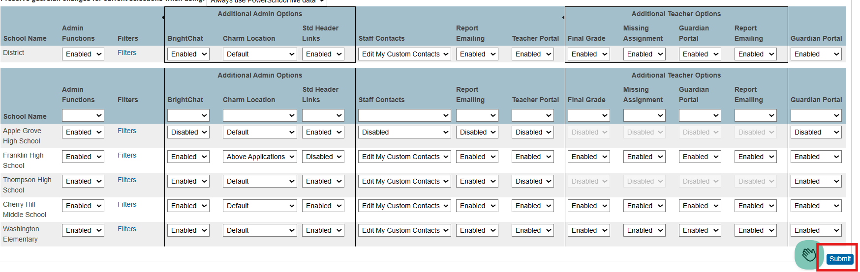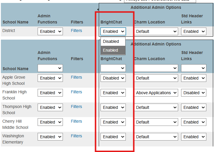 - In the BrightChat column, use the drop-down boxes for the district and/or school to enable/disable BrightChat accordingly