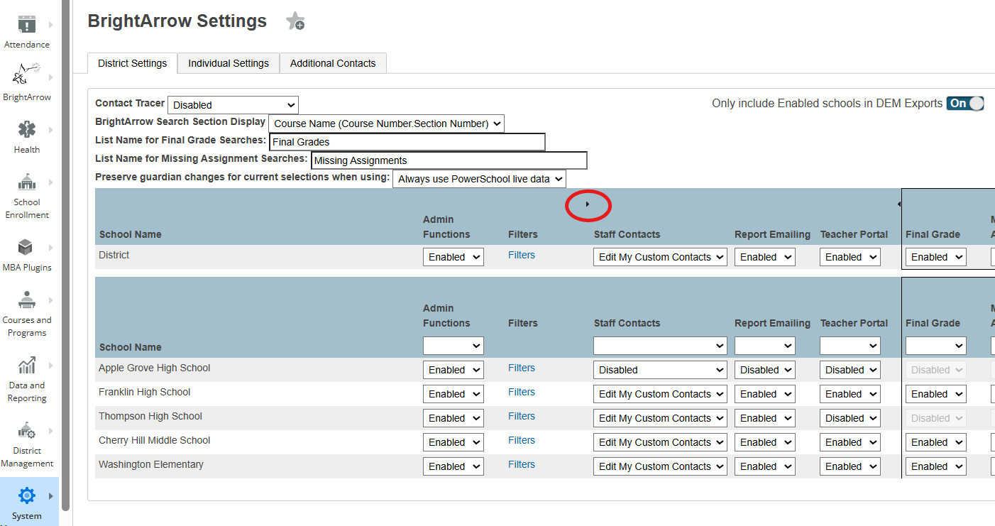 - On the BrightArrow Settings page, click the tiny arrow above "Staff Contacts" to open Additional Admin Options