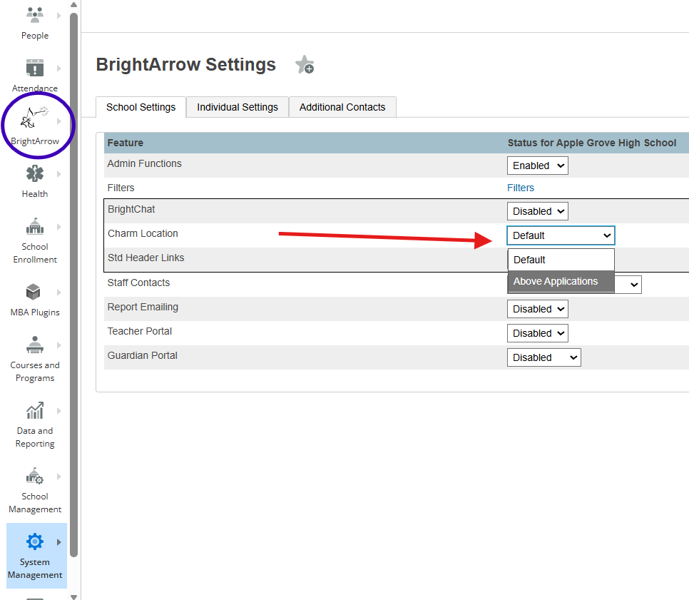 - On the BrightArrow Settings page, click the drop-down in the Charm Location row