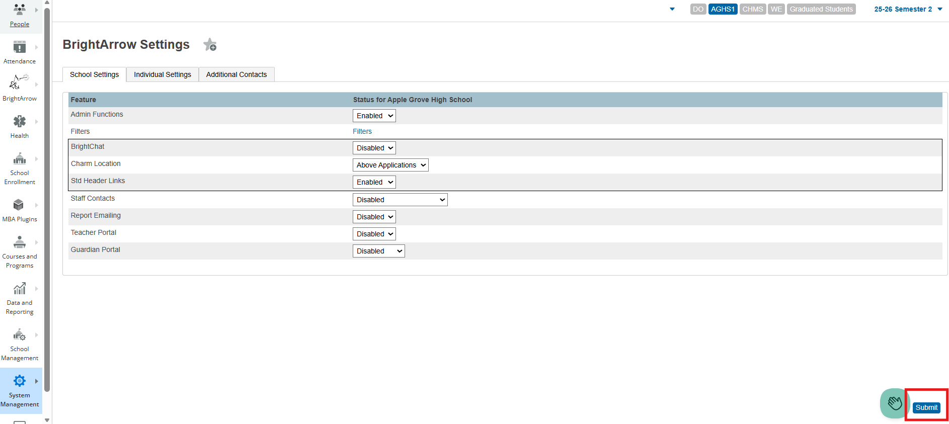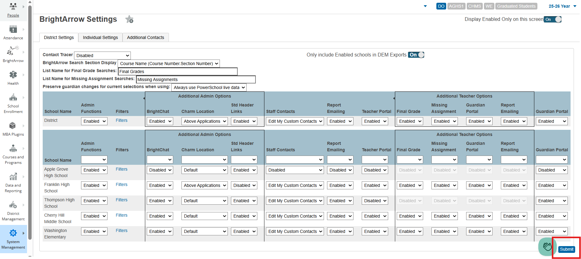 - In the BrightChat column, use the drop-down boxes for the district and/or school to move the Charm Location accordingly.