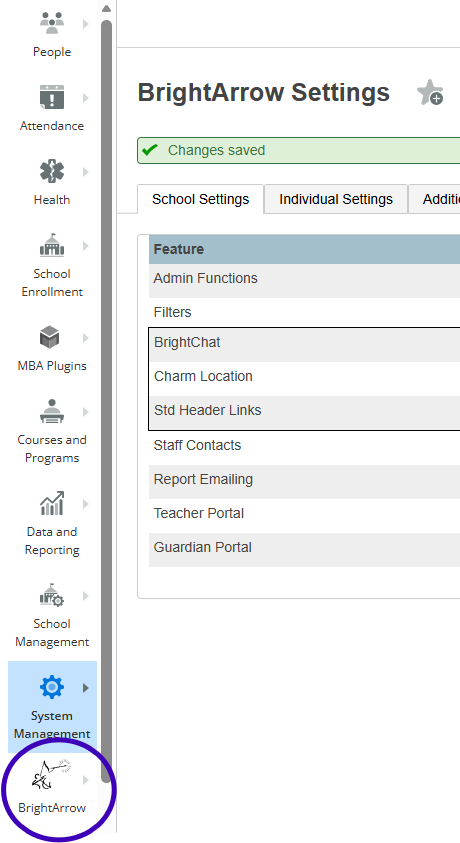 By default, the BrightArrow icon / charm is located near the top of the navigation panel in PowerSchool, but if you want to move it closer to the bottom of the panel you can do that through the BrightArrow Settings.
