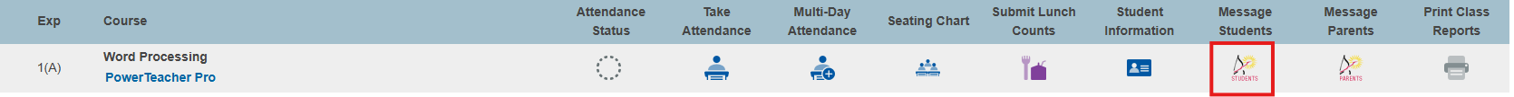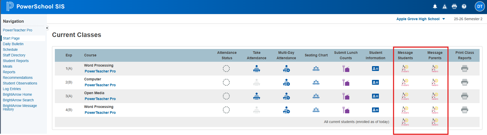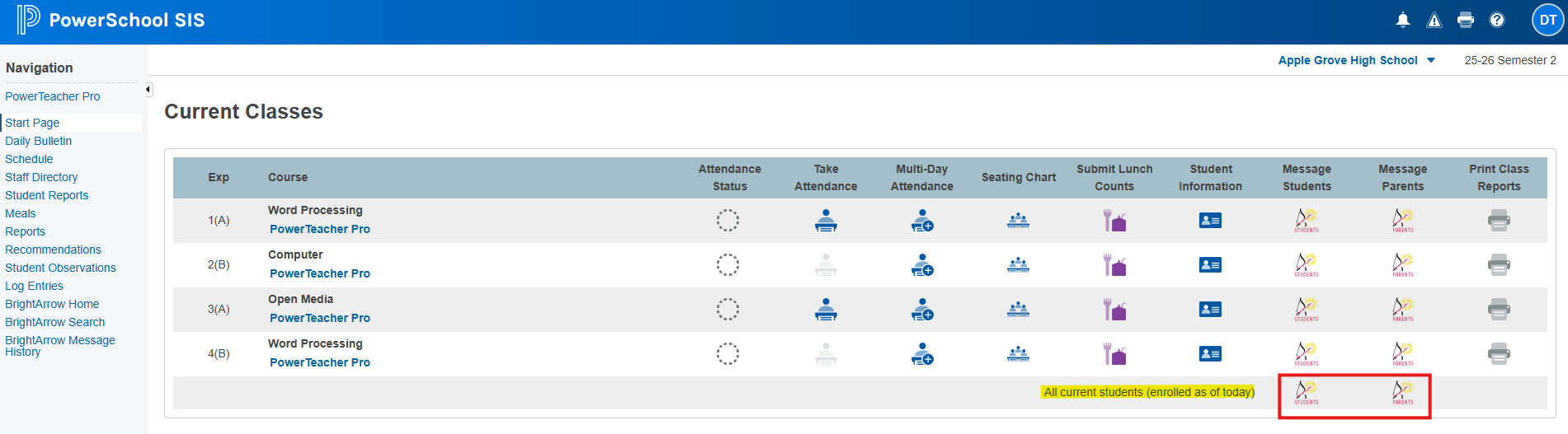 The Current Classes page in PowerTeacher will show you all of your current classes, along with many options such as attendance, seating chart, lunch counts, student information, etc. On the Current Classes page you will see options for each class to Message Students and Message Parents. Use either of the messaging options to create a BrightArrow message to send to the entire class.